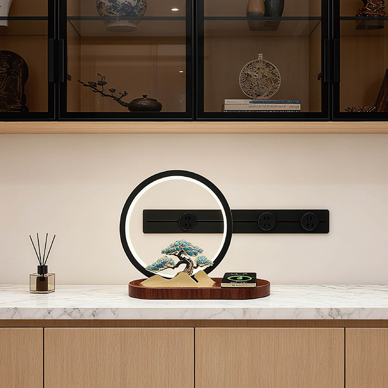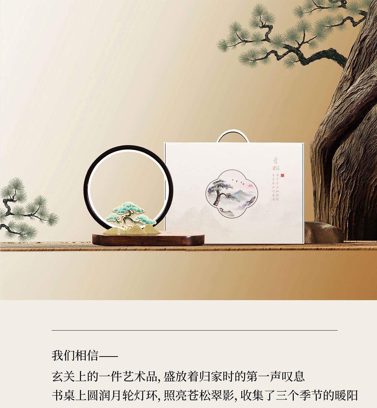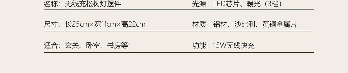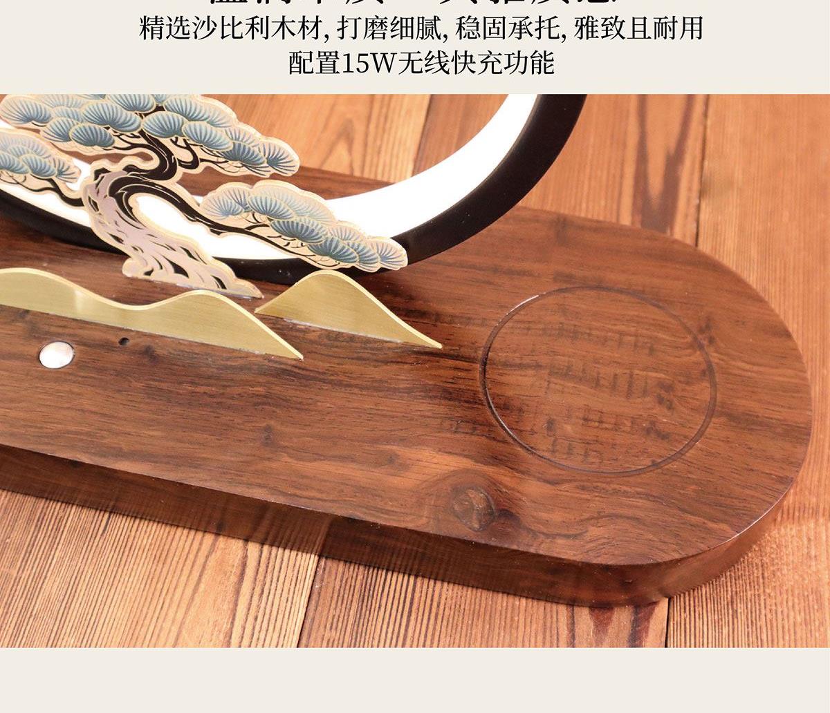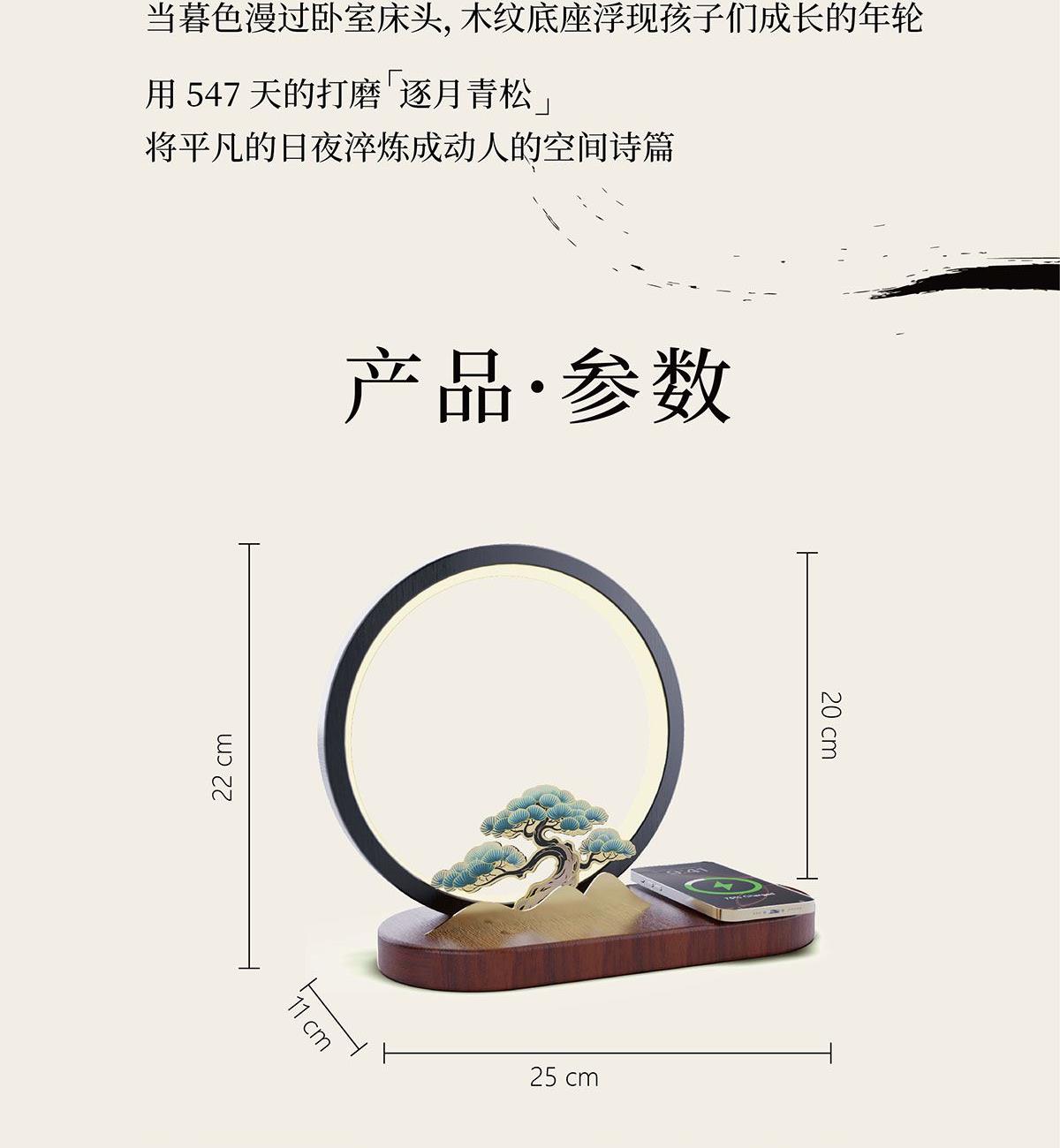 逐月青松 無線充松樹燈擺件 配置功能 發(fā)光燈(暖光3檔)15W手機無線快充底座L0G0定制 材質(zhì) 主體:鋁材、硅膠、黃銅金屬片底座:沙比利木 尺寸 木質(zhì)底座擺件規(guī)格:250x110x220mm手提盒尺寸:270x130x250mm