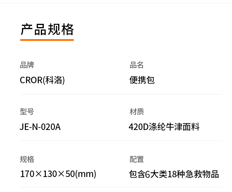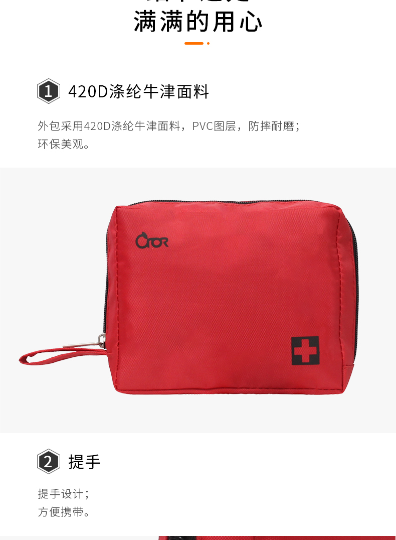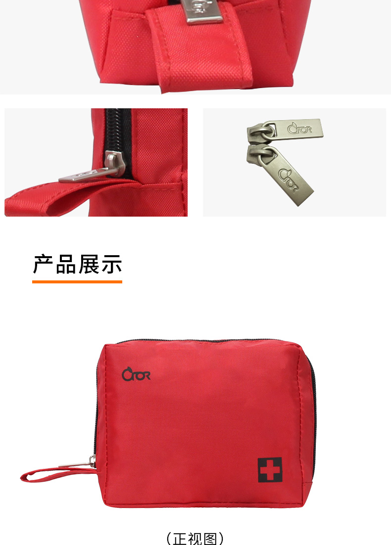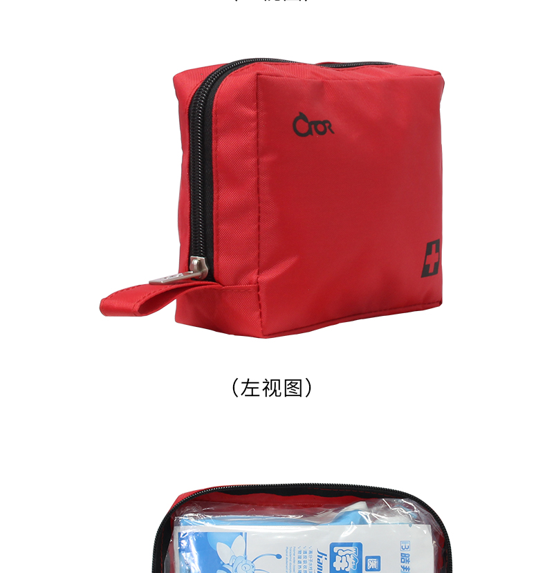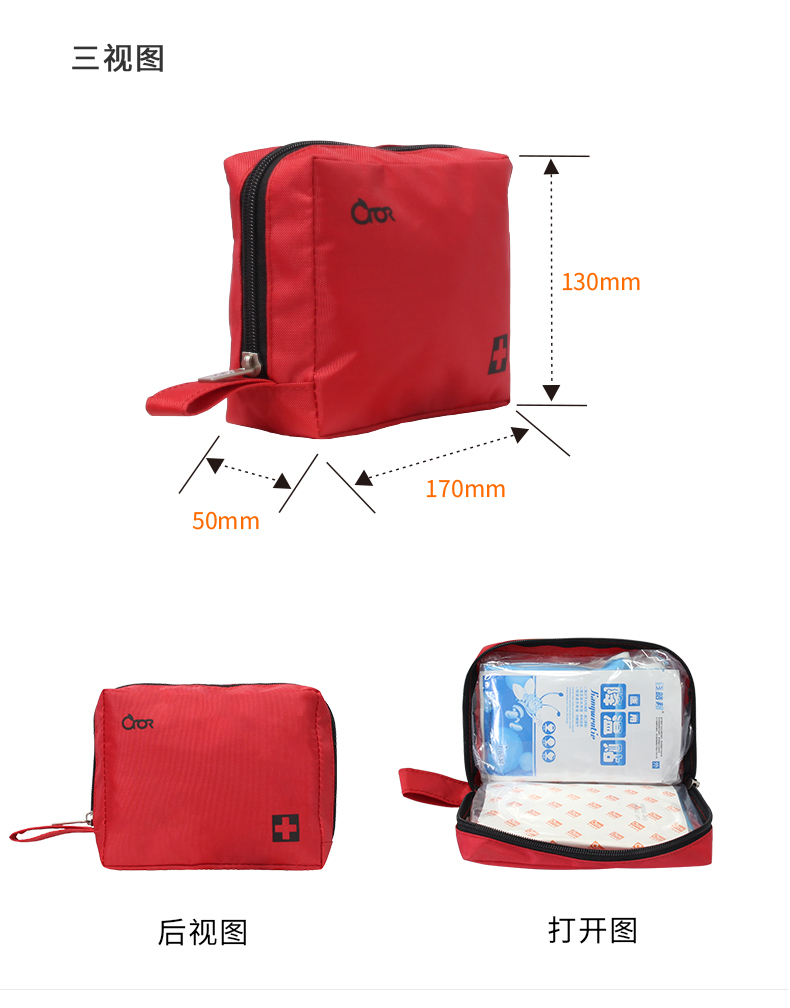 產(chǎn)品材質:420D 牛津布 產(chǎn)品規(guī)格:170*130*50mm 產(chǎn)品顏色:紅色 產(chǎn)品配置:含6大類18種急救用品