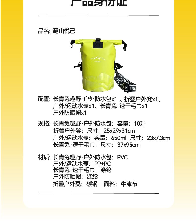 禮盒配置:長(zhǎng)青兔趣野·戶外防水包 x1 、 長(zhǎng)青兔·速干毛巾x1、戶外防曬帽x1 折疊戶外凳x1、漸變運(yùn)動(dòng)水壺x1 產(chǎn)品規(guī)格:戶外防水包-10升 PVC 速干運(yùn)動(dòng)毛巾- 37x95cm 運(yùn)動(dòng)水杯-650ml pp+pc 戶外防曬帽-滌綸 折疊戶外凳 -25x29x31cm