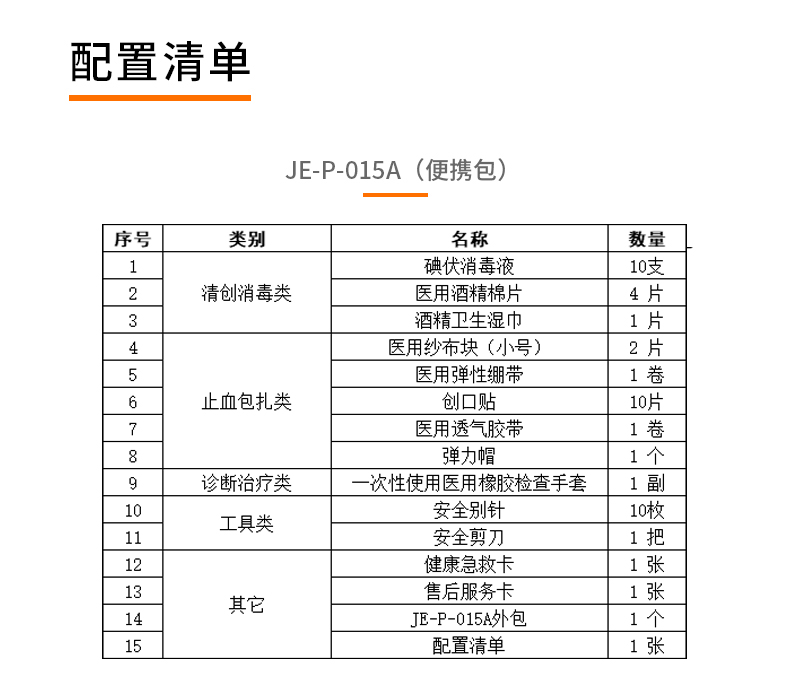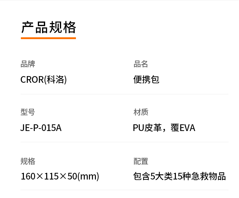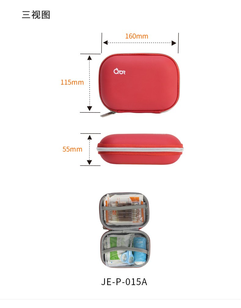 產(chǎn)品材質(zhì):PU革覆EVA 產(chǎn)品規(guī)格:160*115*50mm 產(chǎn)品顏色:紅色 產(chǎn)品配置:含5大類15種急救用品