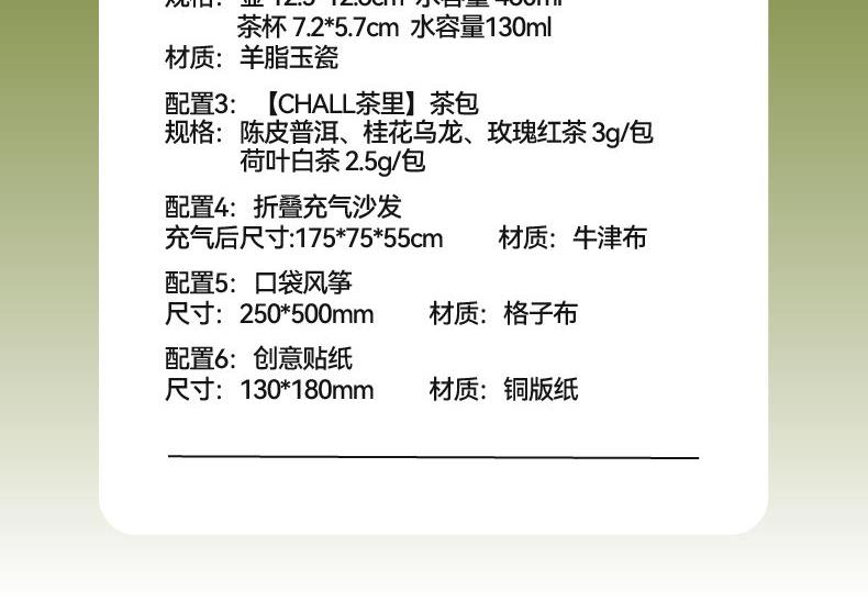 禮盒配置:折疊收納箱*1 陶瓷杯壺兩件套* 1 【CHALL茶里】茶包*4 折疊充氣沙發(fā)*1 口袋風箏*1、貼紙*1 產(chǎn)品規(guī)格:收納箱-42*28*23cm 杯壺兩件套-壺 12.5*12.6cm 容量 460ml 茶杯 7.2*5.7cm 水容量130ml 充氣沙發(fā)-充氣后尺寸:175*75*55cm 口袋風箏-250*500mm